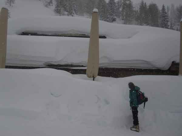 Es schneit noch immer. Da ist ein Hüttendach sehr angenehm für die Stehrast - solange die